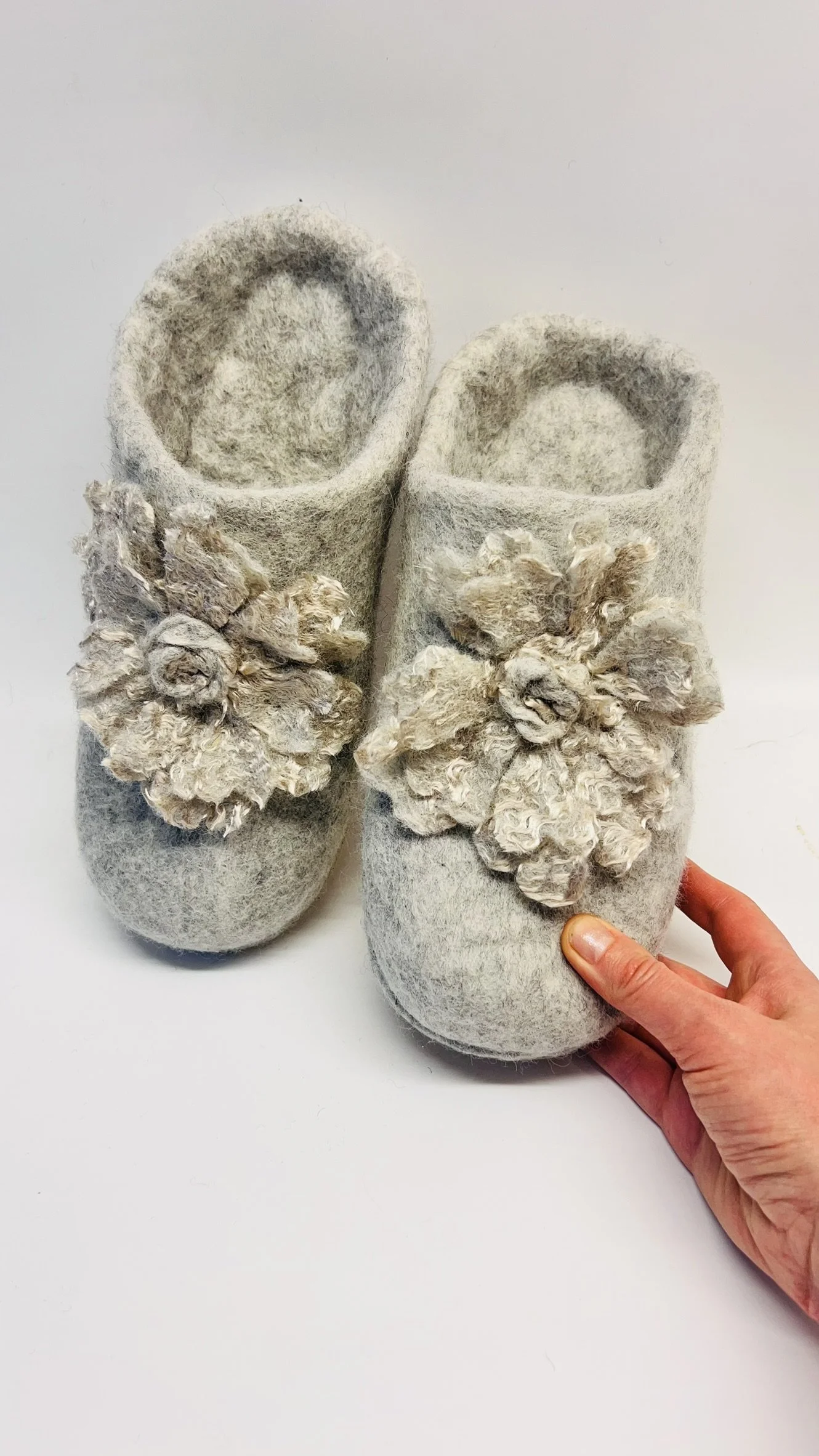 Air them regularly after use - wool naturally resists bacteria and odor without washing. Spot-clean with cool water only if needed. Avoid machine washing, wringing, or direct heat sources like radiators and direct sunlight, which can cause shrinkage. With gentle care, a hand-felted pair maintains its structure and performance for years.