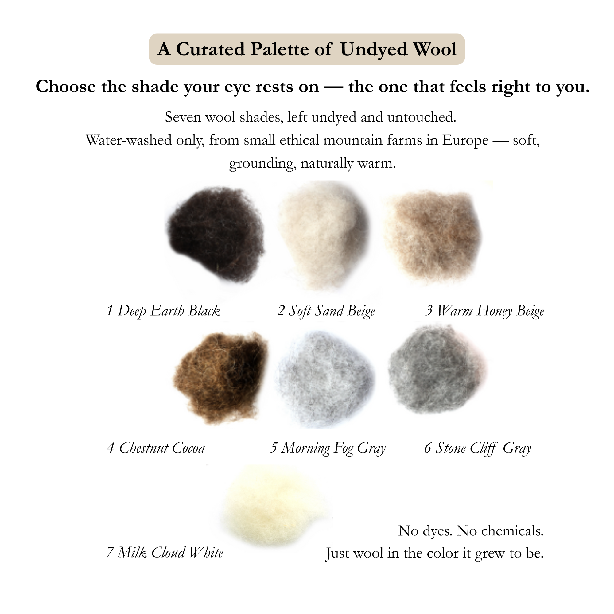 7 natural undyed interior /exterior tones Water-washed only. No dyes, no treatments, nothing added. The color comes entirely from the sheep. The purest option for sensitive skin — especially important in warmer months when feet sweat more, or for anyone avoiding synthetic contact year-round.