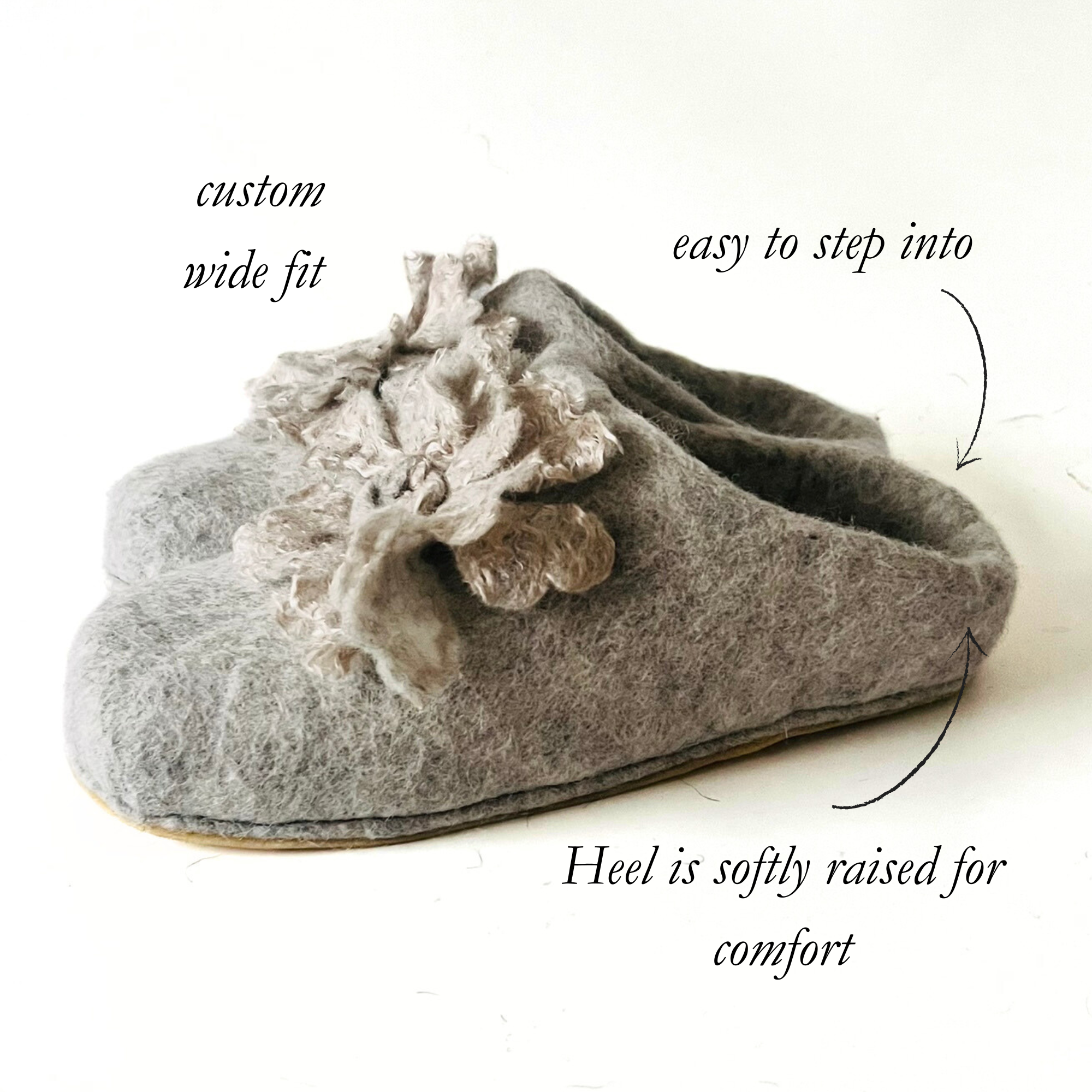 Purchase the regular fit slippers and email us with your measurements or describe the custom fit you need. Dovile will respond within 24 hours to confirm your measurements and discuss any adjustments — an additional fee will apply depending on the complexity of your customization. You can also add a note at checkout — "wide fit," "bunions," or "high instep" — and describe your fit challenges.